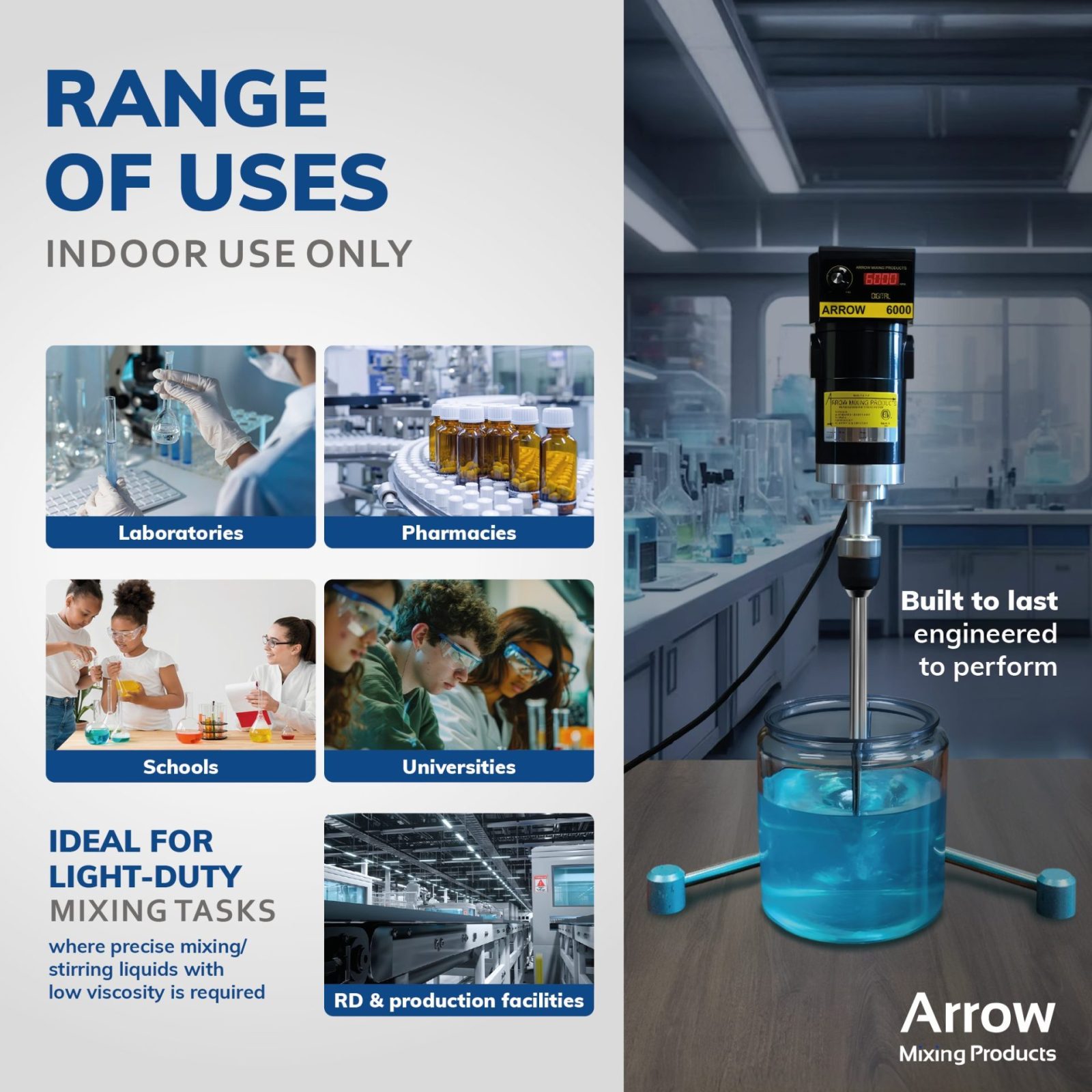 Since 1945, Arrow Mixing Products has manufactured industrial-grade laboratory mixers made in the USA, built to last. Our pneumatic and electric mixers are trusted across industries because they combine safety, durability, and flexibility, all backed by responsive customer support. Below, we answer some common questions that highlight the value Arrow brings to every customer.