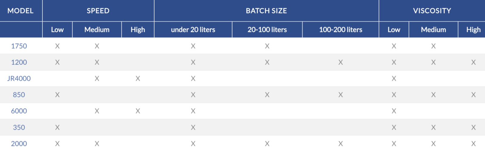 A: Batch size and viscosity are the most essential starting points. Here’s a quick breakdown of models based on the size and type of mixture you’re working with: